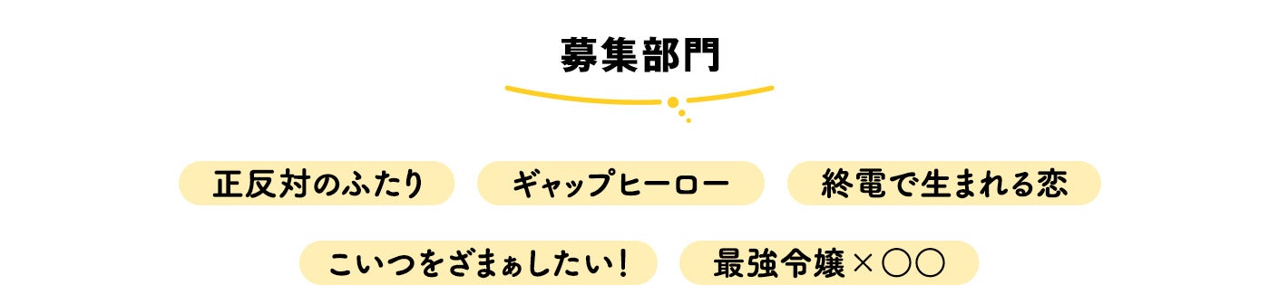 賞 | 部門賞〈各部門1作品〉 デジタルギフトカード5,000円分+講評付き レーベル賞〈作品数未定〉 デジタルギフトカード5,000円分+講評付き はじめて投稿賞〈対象の中から抽選で野いちご・ベリーズカフェ・ノベマ!各5作品〉 デジタルギフトカード1,000円分 ※今まで投稿したことのなかったサイトにはじめて投稿・エントリーした人が対象となります。 エントリー特典〈エントリー作品から各部門数作品〉 編集部おすすめ作品として講評が付きます! ※部門賞、レーベル賞受賞作品に重複してエントリー特典は付与されません。 ※原則1人につき1作品までとなります。複数エントリーいただいた場合はいずれか1作品が対象となります。 |