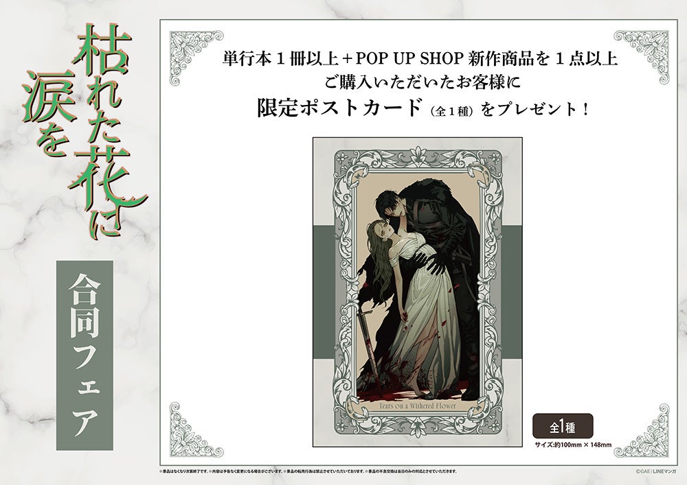 単行本「枯れた花に涙を」1・2巻いずれか1冊以上とPOP UP SHOP新作商品1点以上お買い上げで限定ポストカードをプレゼント!