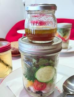 ガラス製の容器(ジャー)に野菜、蒸し鶏、雑穀、お豆が入ってて、上のは柚子胡椒ソース。これをお皿に開けて、上からソースをかけると