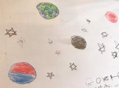 地球を描くってのに全部を黒く塗りつぶす発想は大人にはなかなか無い。びっくりして「暗黒物質に覆われてしまった地球…!?もしくは油まみれの!?」とあらぬ方向へ向けた想像力をその子は「電気が全部消えちゃった地球」って。可愛いわぁ。でも一番それあり得る事態かもしれないわぁ。深いわ。