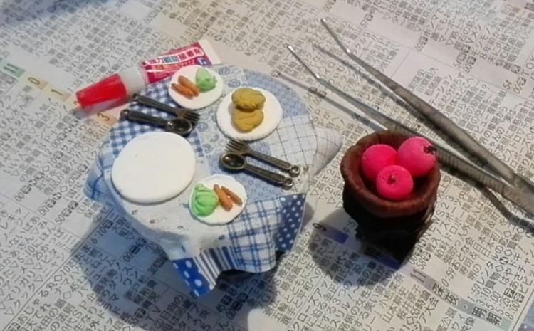 ようやく落ち着いて、ドールハウスをちょこっとしました。細かいのが出来てきましたよ。今日はテーブルを完成させました。