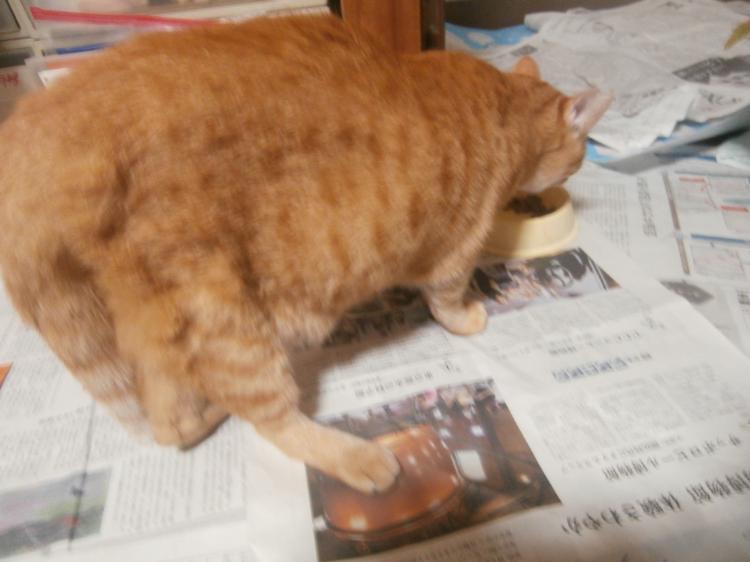 後ろ足を乗せて、ねこがえさを食べたい一心で、前足と背を伸ばした時に、