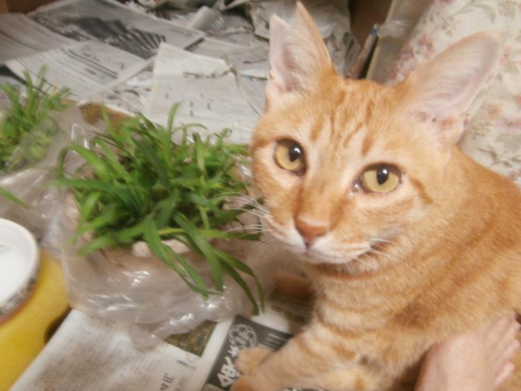 けさ、畑に行ったので、草取りのついでに新鮮な草を鉢に入れてもってかえった。このごろは食欲旺盛になってきたので、カリカリだけでは心配なので、たまにイワシを煮たり、カリカリにちくわを混ぜたり、薬草と思って、猫が好む草を採って帰り、猫の前においとくと、よく食べている。