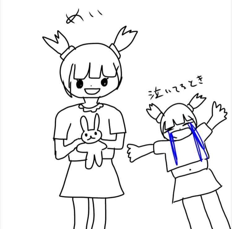 黒髪でつむじから10センチくらいのところで縦に伸びるようなツインテールをしている。そしてくりっとした黒い瞳、まんまるとした輪郭からすごく子供な雰囲気。