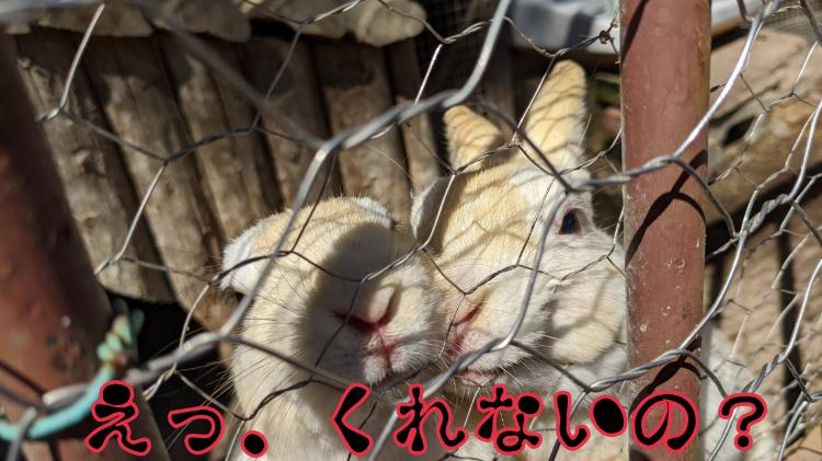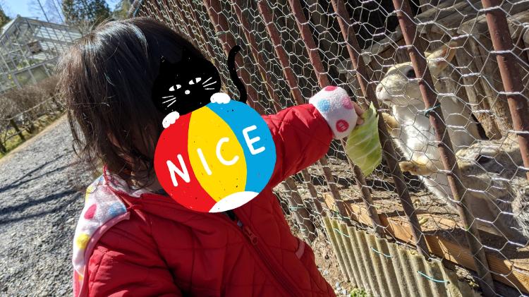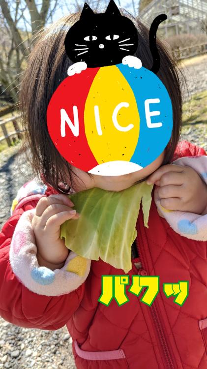 家で洗って持ってきたキャベツを手に…超絶ビビりながらも、ウサギさんにハイどうぞ〜♪