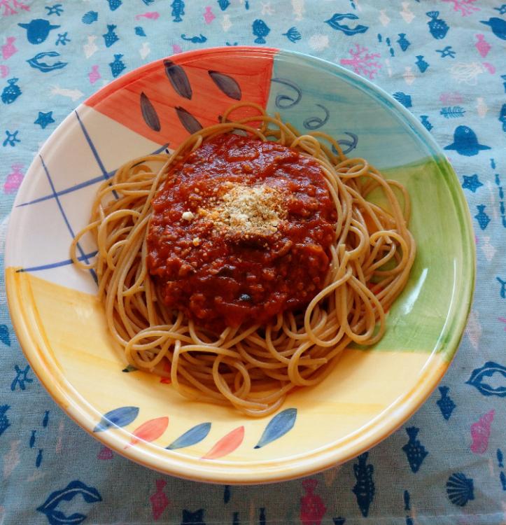 トマト煮込みハンバーグのあとのソースでミートソースパスタ。