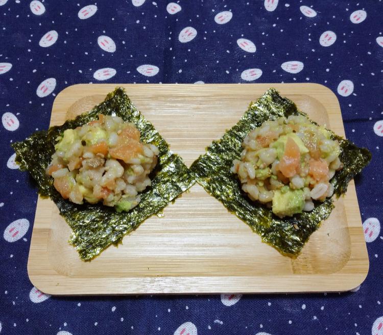 ボウルの中にはサーモンをなめろう状にたたいたものと麦、ネギ、ゴマが入っていた。
