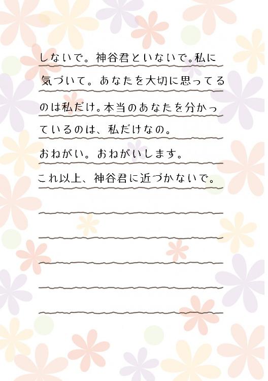 咲乃は便箋を丁寧に折りたたんで封筒へ戻した。二通目の、差出人不明の手紙。筆跡はもちろん、一通目の手紙と同じものだ。手紙の差出人は、咲乃が手紙を読んだ後も変わらずに神谷に接していたことが気にくわなかったらしい。