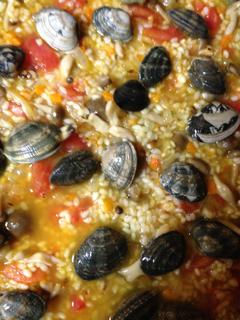 あとで煮込むので、中まで火が通らなくても大丈夫だけど、ワイン振って出てきた汁に魚介などの味が出るので、いい味のパエリアなります。