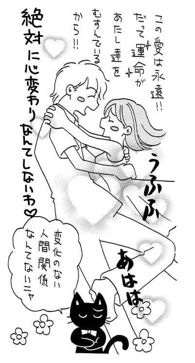 あったりまえじゃない! なんたって私が選んだ王子様だもの。仕事だってできるし、私のことも大切にしてくれるし。あ~、結婚って、なんて素晴らしいの! 明日からは私だけの王子様との甘~い新婚生活が待っているわ!! 朝も夜も愛しあっちゃうんだから。この愛は永遠よ……。