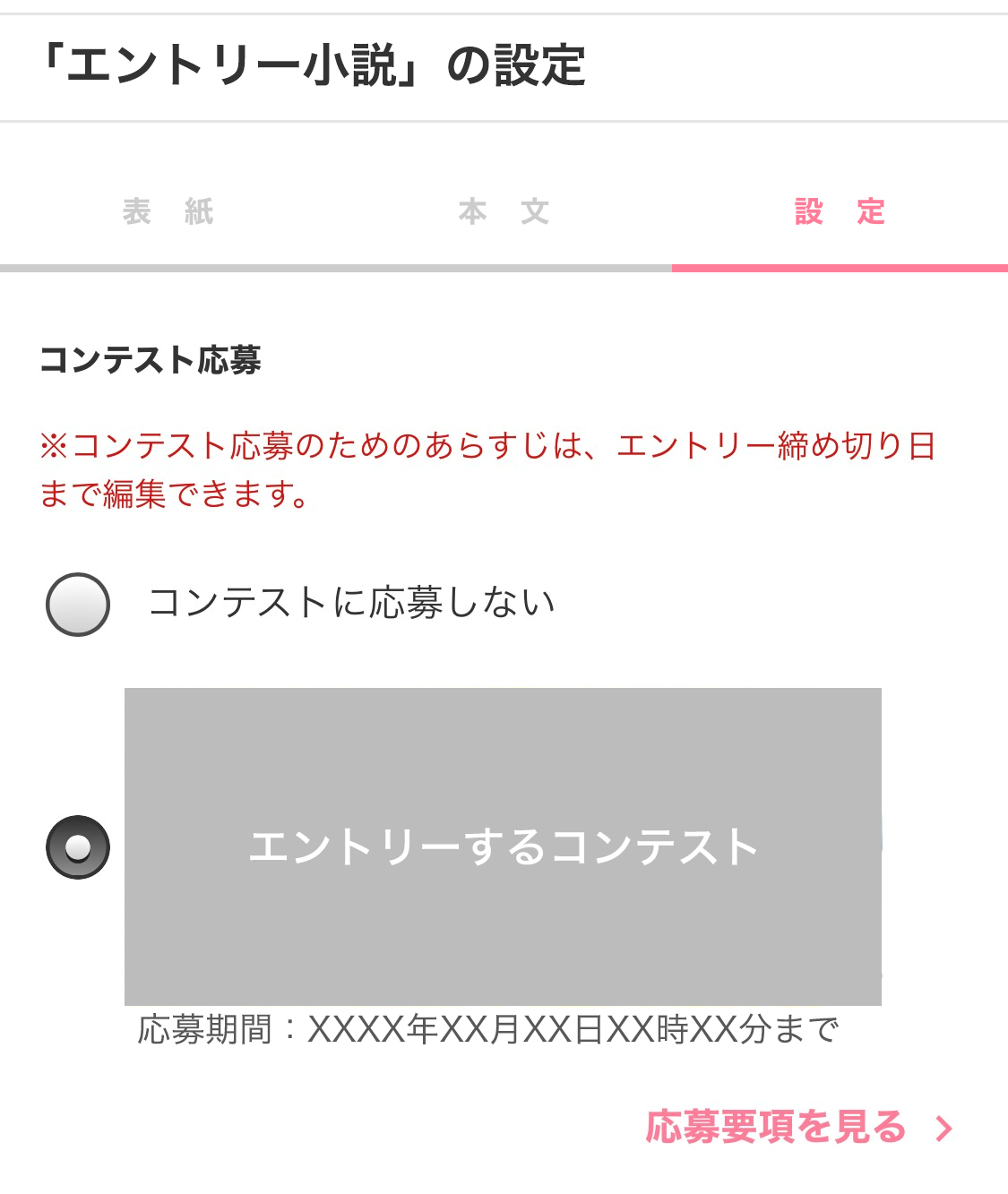 | 応募方法 | STEP1 エントリーしたい作品の【作品編集】から、【設定】画面のコンテスト応募、「マカロン文庫新人コンテスト」を選択します。 STEP2 エントリーする作品のあらすじを入力してください。 STEP3 ページ最下部の【設定を保存する】ボタンを押すとエントリー完了です。